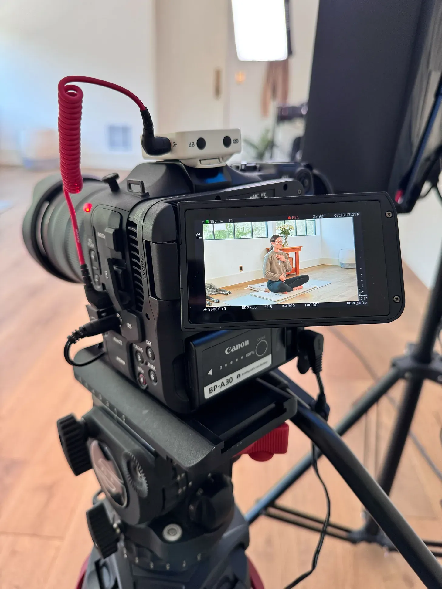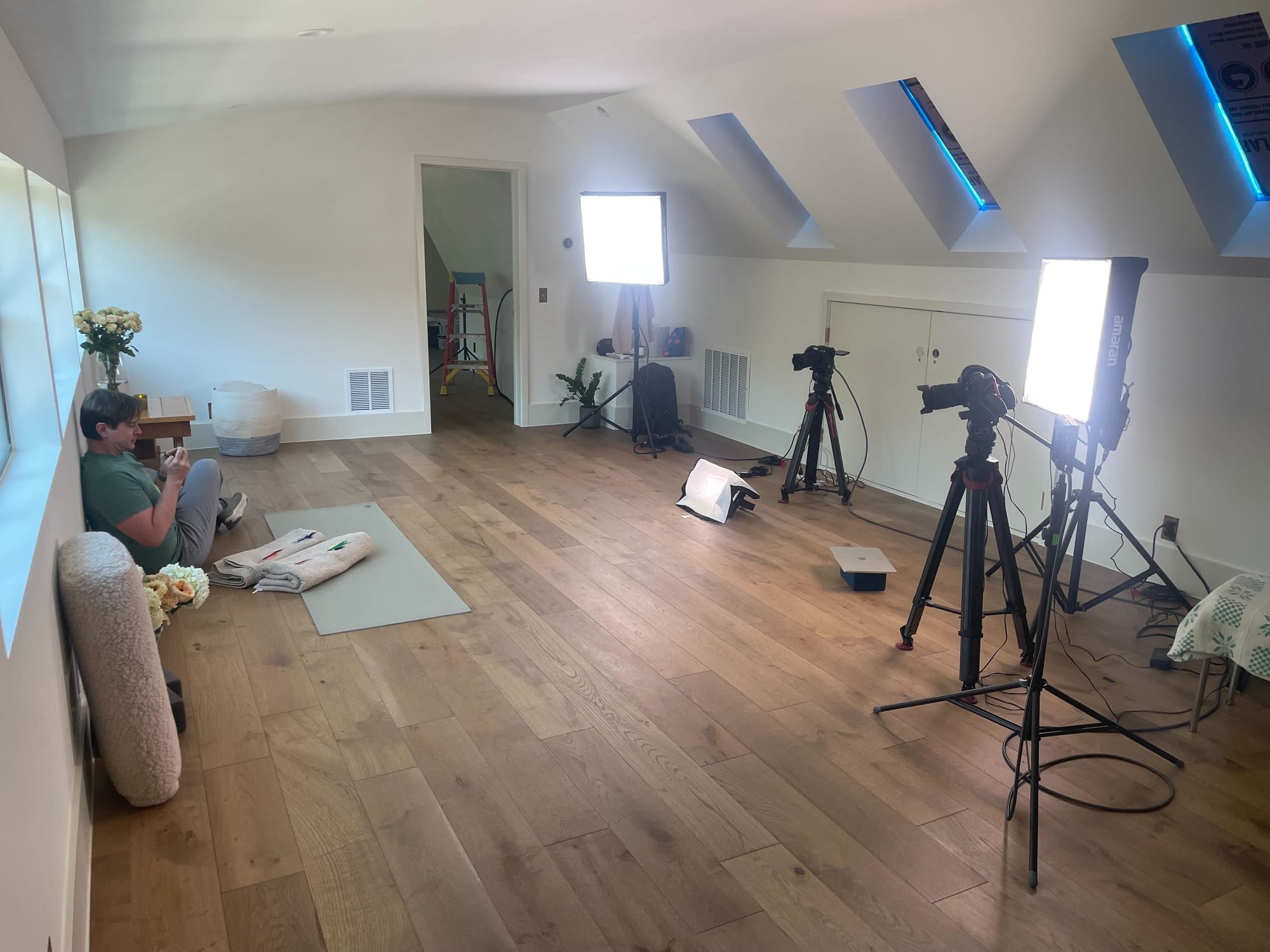 I snapped a photo while Grant was rolling cameras on Adriene and Benji. The cords are a little less tidy than usual, but that’s because we had been moving everything around and experimenting just moments before.